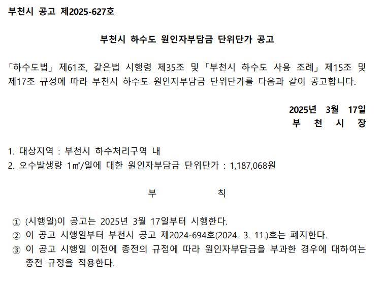 부천시 하수도원인자부담금 단위단가 공고 (2025년)