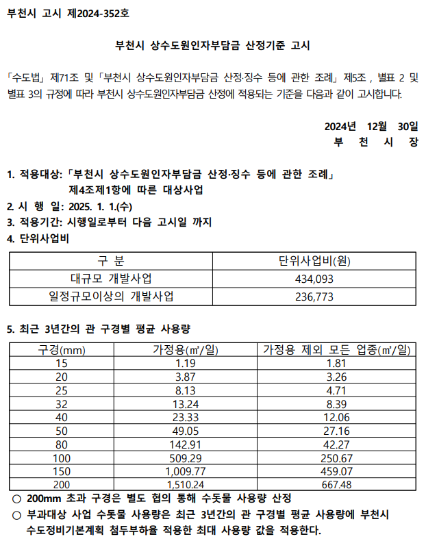 부천시 상수도원인자부담금 산정기준 고시 (2025년)