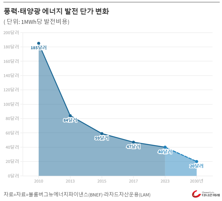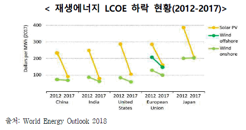 2012년~2017년 태양광 발전의 균등화발전비용(LCOE)는 65% 하락했다.육상풍력은 15%, 해상풍력은 25% 하락했다.