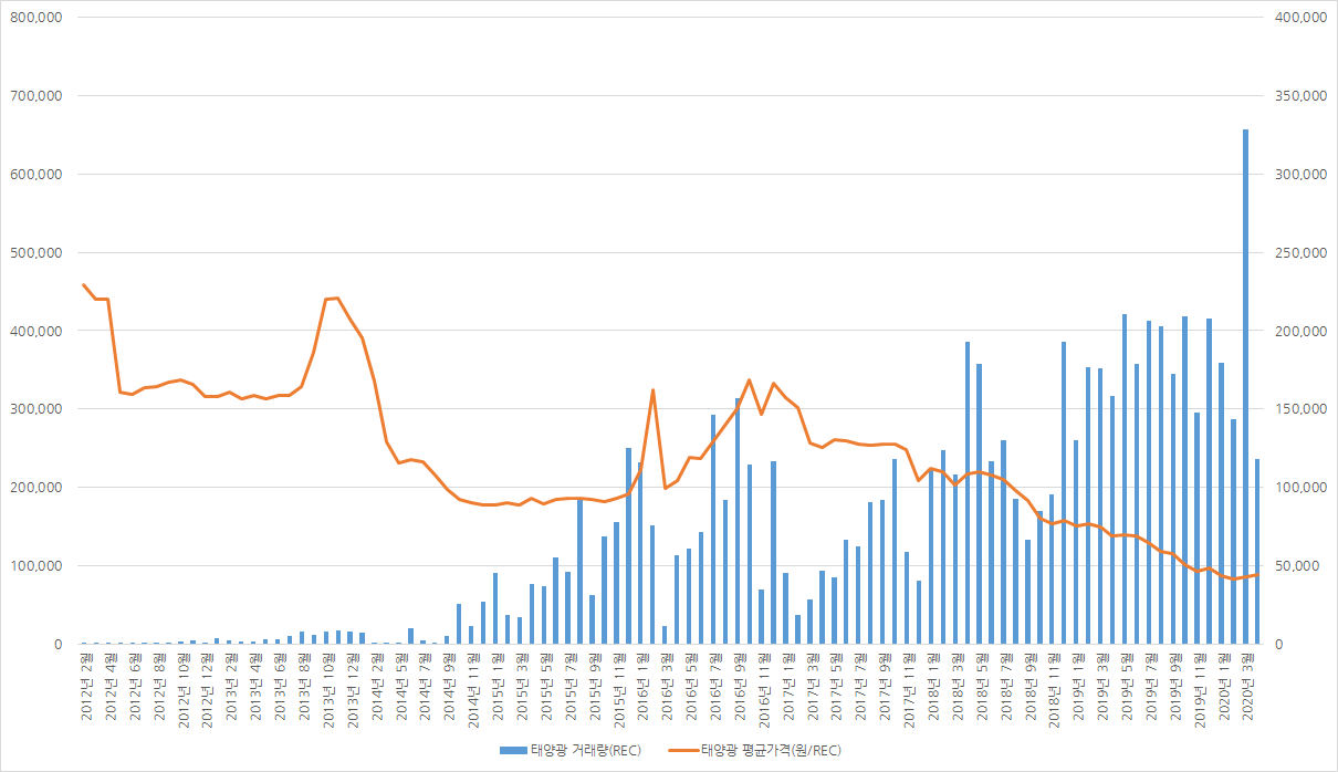 <태양광·비태양광 REC 연평균 가격 [단위: 원/REC]/자료:한국전력거래소>