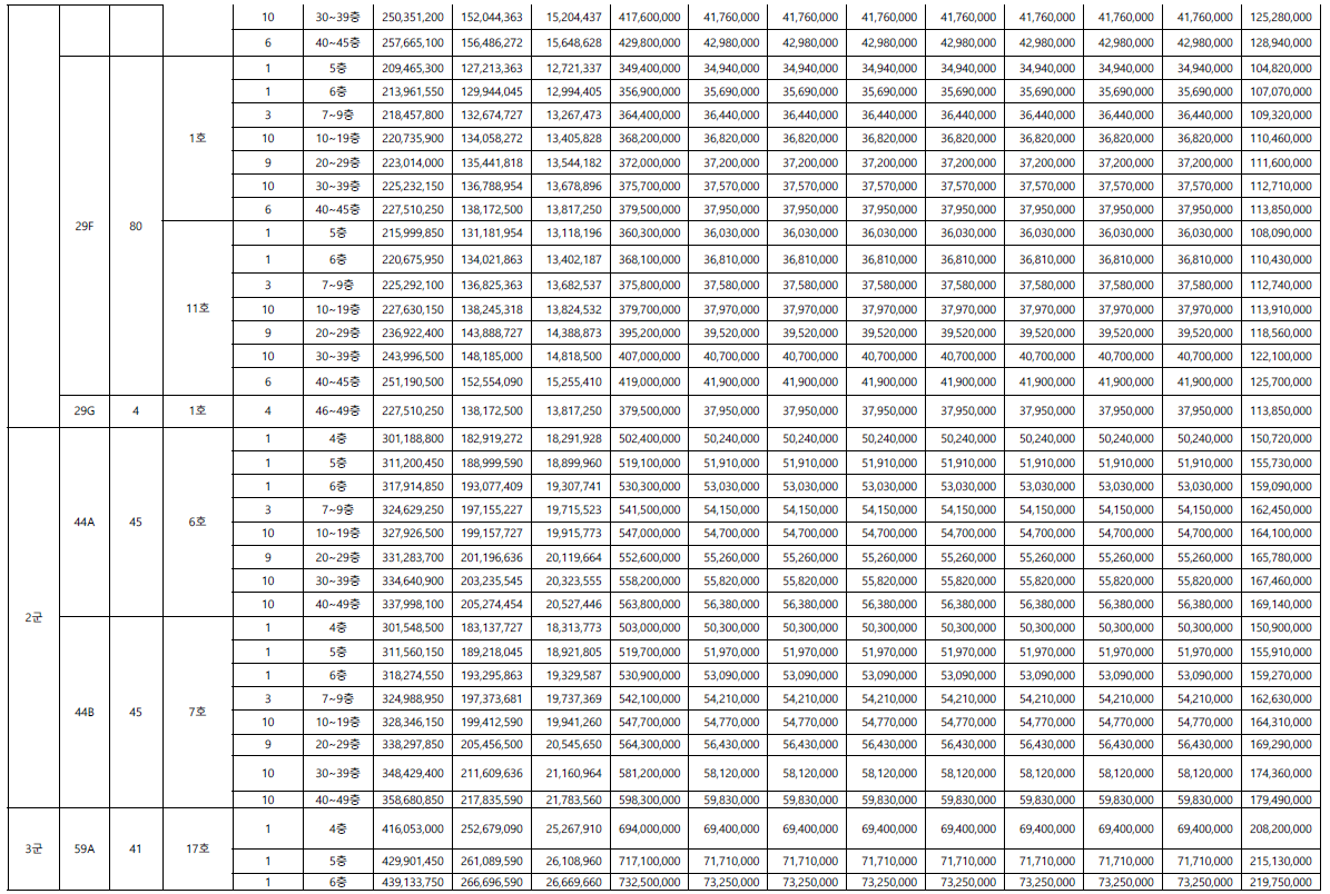 - 모델명 1은 29㎡, 2는 44㎡, 3은 59㎡ 이다.