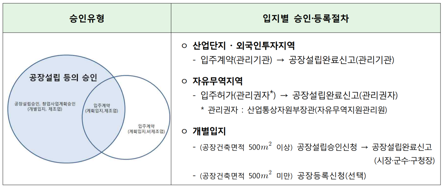 공장설립 승인은 개별입지와 계획입지(입주계약)를 포함하며, 공장 설립을 위한 인허가 단계 중 가장 앞단에 있다.