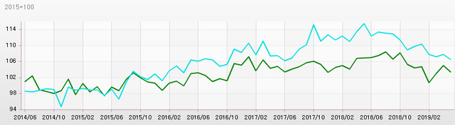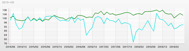 생산지수와 출하지수는 하락 추세에 있다. 하락의 폭은 제조업 평균보다 크다. 재고지수는 2017년 1월 이후 지속적으로 상승하고 있으며, 제조업 평균보다 훨씬 가파르게 늘어나고 있다.