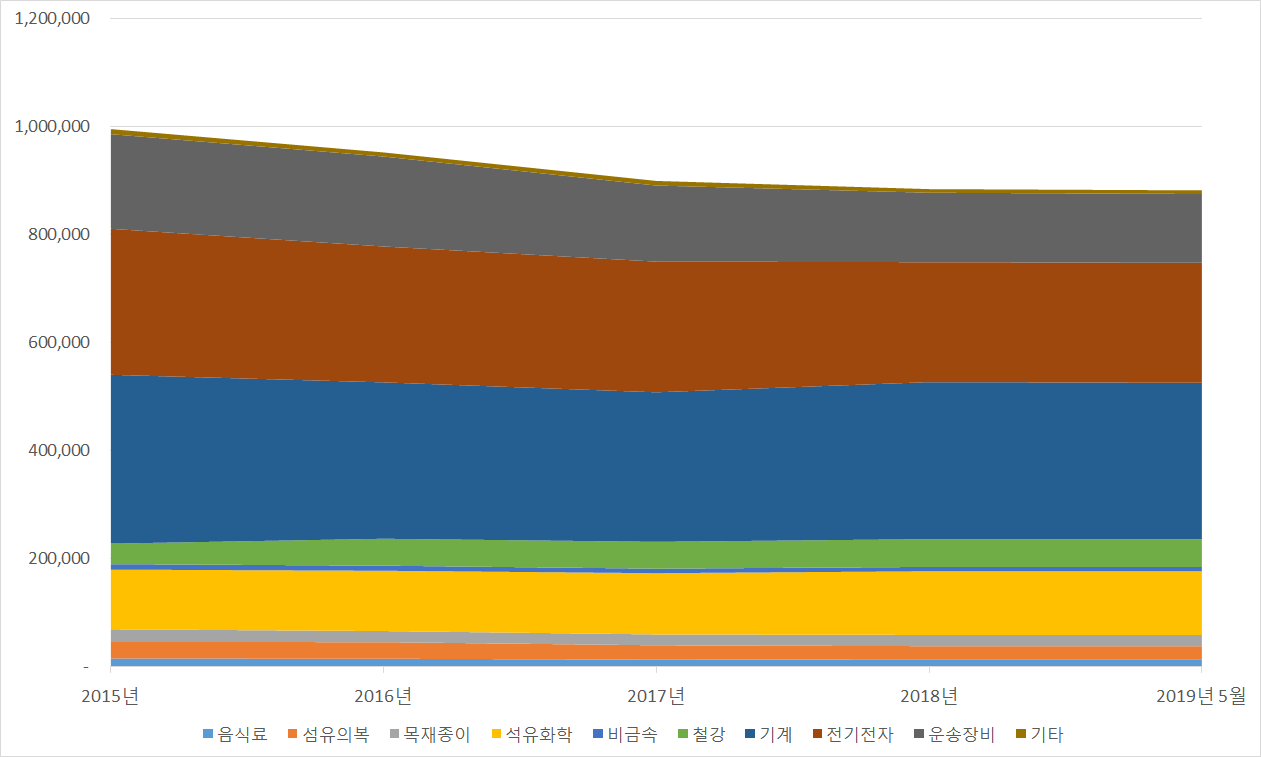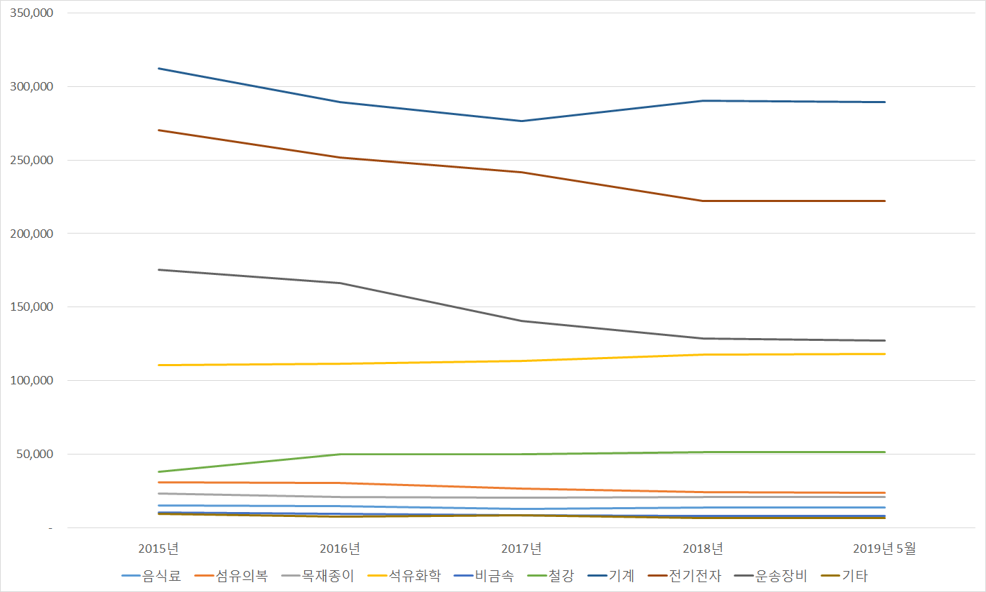 2018년 9월부터 2019년 5월까지 월간 생산실적 그래프이다. 업종별로 보면 석유화학이 가장 큰 비중을 차지하며 생산실적은 하락하는 추세이다. 석유화학과 더불어 기계의 하락폭이 크고, 운송장비는 연초 하락했다가 다시 증가하는 추세이다.