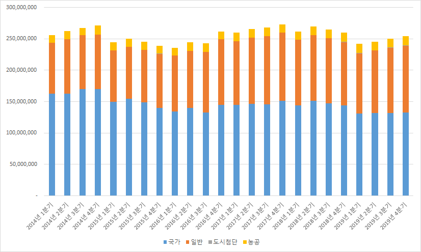 2014년 1분기부터 2019년 1분기까지의 생산금액이다. 2014년 1분기 산업단지의 생산은 256조원이며, 월 85조원이다. 2019년 1분기 산업단지 생산은 242조원이며, 월 81조원 수준이다.