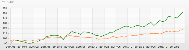 초록선 : 화학물질 및 화학제품제조업;의약품제외 생산자제품 재고지수(계절조정)