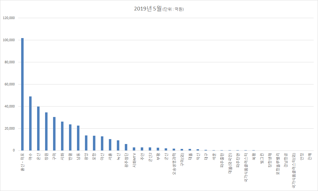 2019년 5월 국가산업단지 생산실적은 41.6조원이다. 산업단지 별로 살펴보면 울산·미포가 10조원으로 가장 높으며, 그 다음은 여수국가산업단지, 온산국가산업단지, 창원국가산업단지, 구미국가산업단지, 시화국가산업단지, 반월국가산업단지, 남동국가산업단지,광양국가산업단지, 포항국가산업단지 순이다.