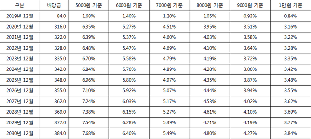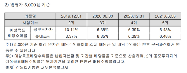 2019년 배당에는 큰 기대를 하지 않아야 한다. 투자설명서에는 수익률을 10.11%로 명기해놓았는데, 연환산 배당수익률이라고만 되어 있고, 보유 기간이 얼마인지, 배당금이 얼마인지에 대한 설명이 없다. 롯데리츠 사이트에는 문의를 받는 연락처 하나 제공하지 않고 있다. 관련된 기사를 하나 찾았는데, 2019년 12월 기준 배당금은 주당 84원 정도로 예상한다. 10월 30일 매수하는 사람은 배당까지 2달 보유인 반면, 공모 투자자는 자금이 투입된 시점이 다르다. 굳이 배당금을 명기하지 않을 필요는 없다고 생각한다.