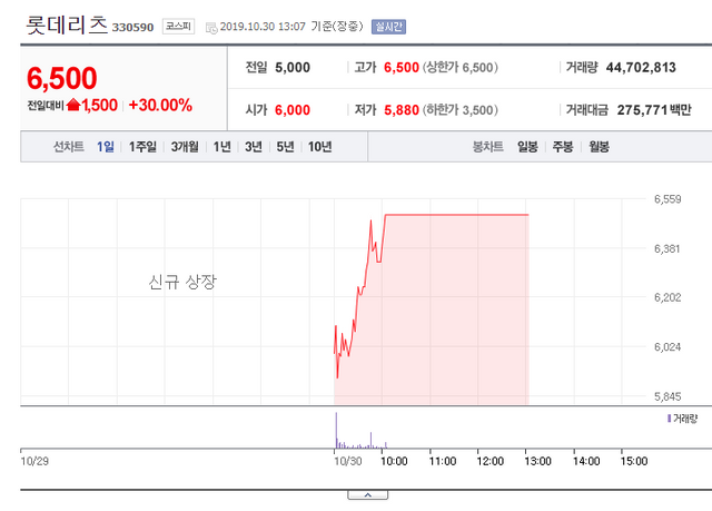 롯데리츠가 10월 30일 증시에 상장되었다. 공모가는 5천원, 동시호가에 의한 시초가는 6천원이었으나, 기준가는 유가업무규정시행세칙에 따라 5천원으로 된다고 한다. 그래서 상한가는 5천원을 기준으로 6,500원이 되었다.