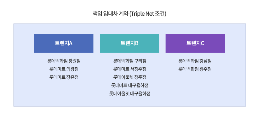 롯데리츠의 부동산 자산은 백화점 4곳, 아울렛 2곳, 마트 4곳으로 구성된다. 매장별로 살펴보면, 백화점은 강남점과 구리점, 광주점, 창원점이 있고, 아울렛은 청주점과 대구 율하점이 있다. 마트는 롯데마트 의왕점, 서청주점, 대구 율하점, 장유점이 있다.