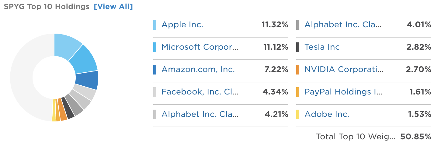 QQQ보다는 SPYG를 추천한다. AUM은 $14.7B이며, 보수는 0.04%로 저렴하다. Top 10 종목비중은 50.85%이다. 0.2%도 높은 건 아니지만, 1/5 밖에 되지 않는다. 그러나 SPYG 평균 스프레드가 0.02% 정도로 높기 때문에 이를 감안해야 한다. 1주당 가격이 QQQ 보다 저렴하다.