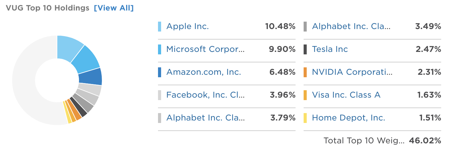 VUG는 수수료 0.04%이며, Top 10 종목 비중은 46%이다.