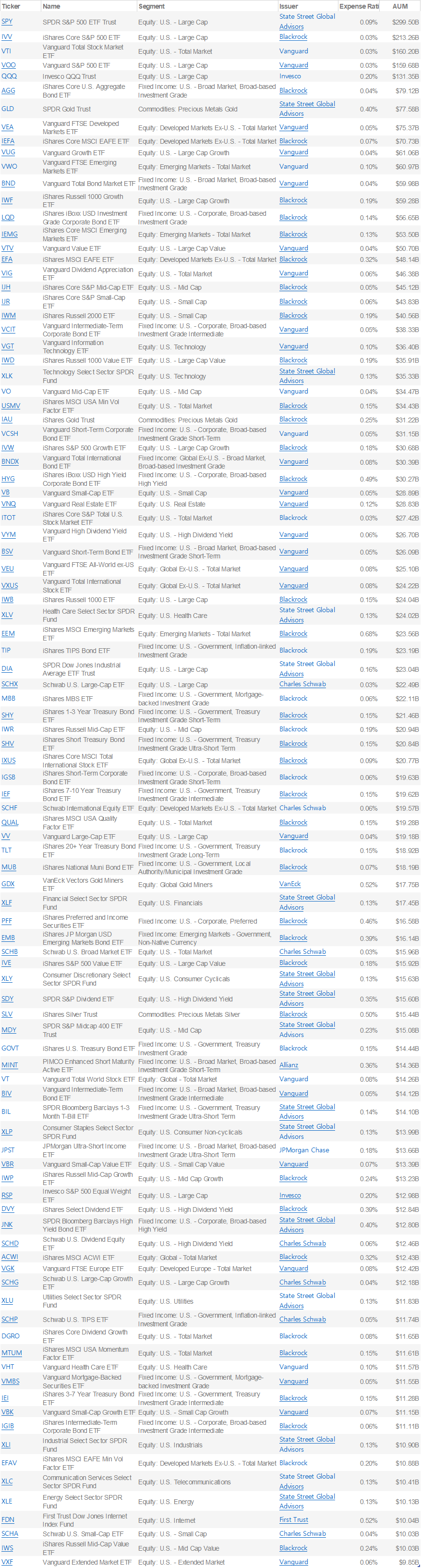 SPY SPDR S&P 500 ETF Trust Equity: U.S. - Large Cap State Street Global Advisors 0.09% $299.50B IVV iShares Core S&P 500 ETF Equity: U.S. - Large Cap Blackrock 0.03% $213.26B VTI Vanguard Total Stock Market ETF Equity: U.S. - Total Market Vanguard 0.03% $160.20B VOO Vanguard S&P 500 ETF Equity: U.S. - Large Cap Vanguard 0.03% $159.68B QQQ Invesco QQQ Trust Equity: U.S. - Large Cap Invesco 0.20% $131.35B AGG iShares Core U.S. Aggregate Bond ETF Fixed Income: U.S. - Broad Market, Broad-based Investment Grade Blackrock 0.04% $79.12B GLD SPDR Gold Trust Commodities: Precious Metals Gold State Street Global Advisors 0.40% $77.58B VEA Vanguard FTSE Developed Markets ETF Equity: Developed Markets Ex-U.S. - Total Market Vanguard 0.05% $75.37B IEFA iShares Core MSCI EAFE ETF Equity: Developed Markets Ex-U.S. - Total Market Blackrock 0.07% $70.73B VUG Vanguard Growth ETF Equity: U.S. - Large Cap Growth Vanguard 0.04% $61.06B VWO Vanguard FTSE Emerging Markets ETF Equity: Emerging Markets - Total Market Vanguard 0.10% $60.97B BND Vanguard Total Bond Market ETF Fixed Income: U.S. - Broad Market, Broad-based Investment Grade Vanguard 0.04% $59.98B IWF iShares Russell 1000 Growth ETF Equity: U.S. - Large Cap Growth Blackrock 0.19% $59.28B LQD iShares iBoxx USD Investment Grade Corporate Bond ETF Fixed Income: U.S. - Corporate, Broad-based Investment Grade Blackrock 0.14% $56.65B IEMG iShares Core MSCI Emerging Markets ETF Equity: Emerging Markets - Total Market Blackrock 0.13% $53.50B VTV Vanguard Value ETF Equity: U.S. - Large Cap Value Vanguard 0.04% $50.70B EFA iShares MSCI EAFE ETF Equity: Developed Markets Ex-U.S. - Total Market Blackrock 0.32% $48.14B VIG Vanguard Dividend Appreciation ETF Equity: U.S. - Total Market Vanguard 0.06% $46.38B IJH iShares Core S&P Mid-Cap ETF Equity: U.S. - Mid Cap Blackrock 0.05% $45.12B IJR iShares Core S&P Small-Cap ETF Equity: U.S. - Small Cap Blackrock 0.06% $43.83B IWM iShares Russell 2000 ETF Equity: U.S. - Small Cap Blackrock 0.19% $40.56B VCIT Vanguard Intermediate-Term Corporate Bond ETF Fixed Income: U.S. - Corporate, Broad-based Investment Grade Intermediate Vanguard 0.05% $38.33B VGT Vanguard Information Technology ETF Equity: U.S. Technology Vanguard 0.10% $36.40B IWD iShares Russell 1000 Value ETF Equity: U.S. - Large Cap Value Blackrock 0.19% $35.91B XLK Technology Select Sector SPDR Fund Equity: U.S. Technology State Street Global Advisors 0.13% $35.33B VO Vanguard Mid-Cap ETF Equity: U.S. - Mid Cap Vanguard 0.04% $34.47B USMV iShares MSCI USA Min Vol Factor ETF Equity: U.S. - Total Market Blackrock 0.15% $34.43B IAU iShares Gold Trust Commodities: Precious Metals Gold Blackrock 0.25% $31.22B VCSH Vanguard Short-Term Corporate Bond ETF Fixed Income: U.S. - Corporate, Broad-based Investment Grade Short-Term Vanguard 0.05% $31.15B IVW iShares S&P 500 Growth ETF Equity: U.S. - Large Cap Growth Blackrock 0.18% $30.68B BNDX Vanguard Total International Bond ETF Fixed Income: Global Ex-U.S. - Broad Market, Broad-based Investment Grade Vanguard 0.08% $30.39B HYG iShares iBoxx USD High Yield Corporate Bond ETF Fixed Income: U.S. - Corporate, Broad-based High Yield Blackrock 0.49% $30.27B VB Vanguard Small-Cap ETF Equity: U.S. - Small Cap Vanguard 0.05% $28.89B VNQ Vanguard Real Estate ETF Equity: U.S. Real Estate Vanguard 0.12% $28.83B ITOT iShares Core S&P Total U.S. Stock Market ETF Equity: U.S. - Total Market Blackrock 0.03% $27.42B VYM Vanguard High Dividend Yield ETF Equity: U.S. - High Dividend Yield Vanguard 0.06% $26.70B BSV Vanguard Short-Term Bond ETF Fixed Income: U.S. - Broad Market, Broad-based Investment Grade Short-Term Vanguard 0.05% $26.09B VEU Vanguard FTSE All-World ex-US ETF Equity: Global Ex-U.S. - Total Market Vanguard 0.08% $25.10B VXUS Vanguard Total International Stock ETF Equity: Global Ex-U.S. - Total Market Vanguard 0.08% $24.22B IWB iShares Russell 1000 ETF Equity: U.S. - Large Cap Blackrock 0.15% $24.04B XLV Health Care Select Sector SPDR Fund Equity: U.S. Health Care State Street Global Advisors 0.13% $24.02B EEM iShares MSCI Emerging Markets ETF Equity: Emerging Markets - Total Market Blackrock 0.68% $23.56B TIP iShares TIPS Bond ETF Fixed Income: U.S. - Government, Inflation-linked Investment Grade Blackrock 0.19% $23.19B DIA SPDR Dow Jones Industrial Average ETF Trust Equity: U.S. - Large Cap State Street Global Advisors 0.16% $23.04B SCHX Schwab U.S. Large-Cap ETF Equity: U.S. - Large Cap Charles Schwab 0.03% $22.49B MBB iShares MBS ETF Fixed Income: U.S. - Government, Mortgage-backed Investment Grade Blackrock 0.06% $22.11B SHY iShares 1-3 Year Treasury Bond ETF Fixed Income: U.S. - Government, Treasury Investment Grade Short-Term Blackrock 0.15% $21.46B IWR iShares Russell Mid-Cap ETF Equity: U.S. - Mid Cap Blackrock 0.19% $20.94B SHV iShares Short Treasury Bond ETF Fixed Income: U.S. - Government, Treasury Investment Grade Ultra-Short Term Blackrock 0.15% $20.84B IXUS iShares Core MSCI Total International Stock ETF Equity: Global Ex-U.S. - Total Market Blackrock 0.09% $20.77B IGSB iShares Short-Term Corporate Bond ETF Fixed Income: U.S. - Corporate, Broad-based Investment Grade Short-Term Blackrock 0.06% $19.63B IEF iShares 7-10 Year Treasury Bond ETF Fixed Income: U.S. - Government, Treasury Investment Grade Intermediate Blackrock 0.15% $19.62B SCHF Schwab International Equity ETF Equity: Developed Markets Ex-U.S. - Total Market Charles Schwab 0.06% $19.57B QUAL iShares MSCI USA Quality Factor ETF Equity: U.S. - Total Market Blackrock 0.15% $19.28B VV Vanguard Large-Cap ETF Equity: U.S. - Large Cap Vanguard 0.04% $19.18B TLT iShares 20+ Year Treasury Bond ETF Fixed Income: U.S. - Government, Treasury Investment Grade Long-Term Blackrock 0.15% $18.92B MUB iShares National Muni Bond ETF Fixed Income: U.S. - Government, Local Authority/Municipal Investment Grade Blackrock 0.07% $18.19B GDX VanEck Vectors Gold Miners ETF Equity: Global Gold Miners VanEck 0.52% $17.75B XLF Financial Select Sector SPDR Fund Equity: U.S. Fina