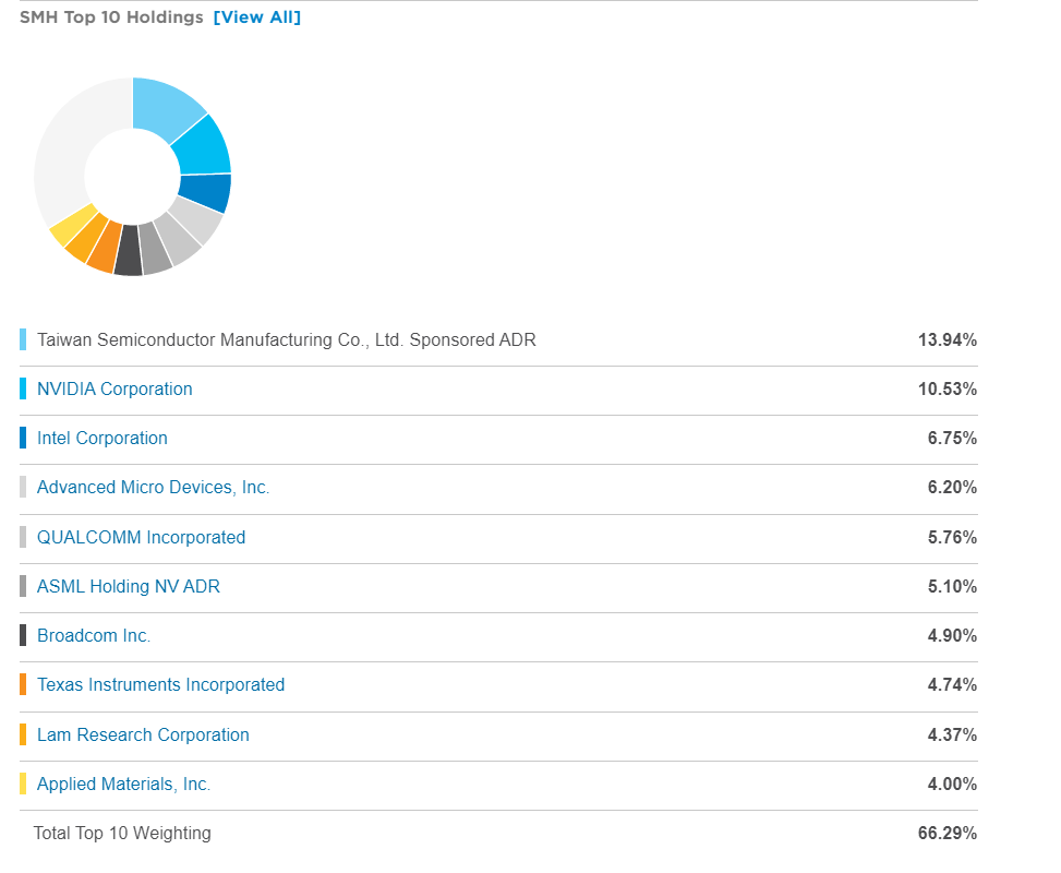 SMH는 구성종목이 굉장히 마음에 듭니다. TSMC와 NVIDIA 비중이 25% 가까이 됩니다. 반도체는 이 종목 하나만 꾸준히 매입해도 될 것 같습니다. 수수료는 0.35%로 SOXX 보다 저렴합니다.