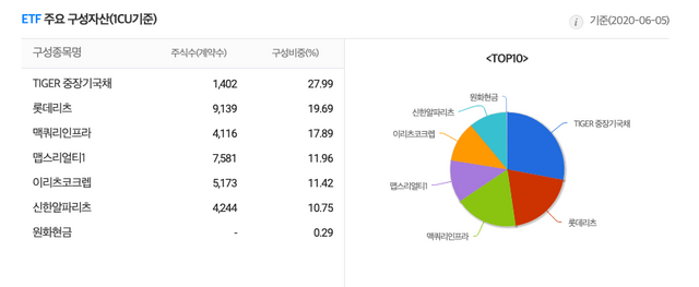 현재 이와 비슷한 종목으로 TIGER 부동산인프라고배당이 있습니다. 가장 큰 차이점으로 TIGER KIS부동산인프라채권TR ETF는 채권 비중을 30% 둔다는 점입니다.