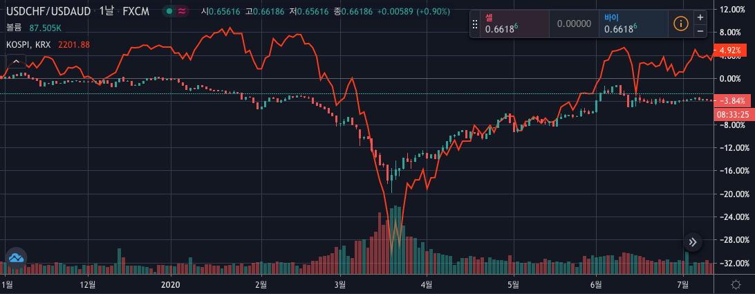 국내 주식에 투자할 때 스위스 프랑, 호주 달러 비율 차트의 방향성을 참고로 살펴보면 좋을 듯하다.