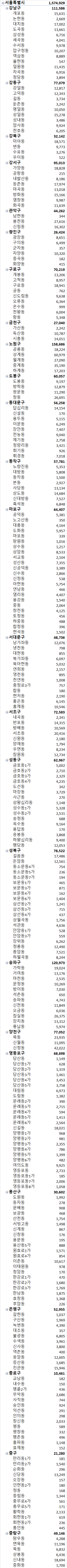 서울특별시 1,574,929 강남구 111,586 개포동 15,631 논현동 2,669 대치동 17,002 도곡동 13,661 삼성동 6,716 세곡동 4,041 수서동 9,978 압구정동 10,207 역삼동 8,889 율현동 547 일원동 11,435 자곡동 6,916 청담동 3,894 강동구 77,079 강일동 12,817 고덕동 12,343 길동 3,734 둔촌동 3,242 명일동 10,050 상일동 15,278 성내동 3,486 암사동 9,924 천호동 6,205 강북구 32,142 미아동 18,571 번동 9,773 수유동 3,276 우이동 522 강서구 95,013 가양동 18,828 공항동 215 내발산동 8,186 등촌동 17,974 마곡동 13,018 방화동 15,166 염창동 9,987 화곡동 11,639 관악구 44,262 남현동 344 봉천동 27,616 신림동 16,302 광진구 26,424 광장동 8,651 구의동 6,499 군자동 357 자양동 10,320 중곡동 182 화양동 415 구로구 70,219 개봉동 13,206 고척동 8,957 구로동 18,941 궁동 762 신도림동 9,638 오류동 6,364 온수동 999 천왕동 6,004 항동 5,348 금천구 27,040 가산동 2,242 독산동 10,787 시흥동 14,011 노원구 158,686 공릉동 18,224 상계동 60,979 월계동 27,090 중계동 35,190 하계동 17,203 도봉구 60,057 도봉동 9,197 방학동 12,879 쌍문동 11,290 창동 26,691 동대문구 56,258 답십리동 14,154 신설동 170 용두동 5,115 이문동 6,249 장안동 7,407 전농동 9,040 제기동 2,758 청량리동 3,421 회기동 926 휘경동 7,018 동작구 57,781 노량진동 5,353 대방동 5,808 동작동 1,500 본동 2,927 사당동 13,134 상도동 14,684 신대방동 7,527 흑석동 6,848 마포구 64,407 공덕동 5,381 노고산동 350 대흥동 4,164 도화동 5,957 마포동 339 망원동 1,016 상수동 1,217 상암동 8,533 서교동 2,104 성산동 7,355 신공덕동 3,389 신수동 2,866 신정동 538 아현동 5,754 연남동 466 염리동 4,407 용강동 1,540 중동 2,064 창전동 4,125 토정동 456 하중동 488 합정동 396 현석동 1,502 서대문구 48,736 남가좌동 12,076 냉천동 798 대현동 855 북가좌동 6,097 북아현동 5,032 연희동 2,157 영천동 895 천연동 1,008 충정로3가 757 합동 180 현저동 2,190 홍은동 6,145 홍제동 10,546 서초구 72,583 내곡동 2,341 반포동 14,315 방배동 10,569 서초동 20,416 신원동 2,180 양재동 1,794 우면동 8,234 잠원동 12,734 성동구 62,967 금호동1가 5,002 금호동2가 2,710 금호동3가 2,329 금호동4가 4,235 도선동 342 마장동 3,729 사근동 270 상왕십리동 1,148 성수동1가 5,328 성수동2가 2,531 송정동 688 옥수동 9,164 용답동 170 응봉동 3,868 하왕십리동 9,400 행당동 12,053 성북구 78,522 길음동 17,486 돈암동 12,561 동소문동4가 754 동소문동5가 236 동소문동7가 194 보문동1가 465 보문동3가 871 보문동4가 162 보문동6가 1,404 삼선동2가 1,241 삼선동3가 715 삼선동4가 437 상월곡동 1,756 석관동 4,636 안암동1가 528 안암동3가 559 장위동 6,262 정릉동 12,490 종암동 7,521 하월곡동 8,244 송파구 120,973 가락동 19,024 거여동 13,176 마천동 2,535 문정동 10,269 방이동 7,030 석촌동 650 송파동 4,743 신천동 11,849 오금동 6,036 잠실동 26,375 장지동 13,312 풍납동 5,974 양천구 77,052 목동 23,935 신월동 11,095 신정동 42,022 영등포구 68,698 당산동 1,149 당산동1가 628 당산동2가 1,319 당산동3가 1,461 당산동4가 3,453 당산동5가 3,758 대림동 6,973 도림동 1,382 문래동2가 390 문래동3가 2,715 문래동4가 594 문래동5가 1,413 문래동6가 2,564 신길동 18,021 양평동1가 968 양평동2가 981 양평동3가 2,355 양평동4가 786 양평동5가 1,399 양평동6가 482 여의도동 9,925 영등포동 2,733 영등포동1가 185 영등포동7가 2,006 영등포동8가 1,058 용산구 30,602 도원동 1,992 동자동 278 문배동 908 보광동 468 산천동 1,754 서빙고동 1,498 신계동 867 신창동 176 용문동 195 용산동5가 888 원효로1가 1,571 원효로4가 854 이촌동 10,617 이태원동 978 청암동 170 한강로1가 470 한강로2가 1,680 한강로3가 1,769 한남동 1,875 효창동 1,368 후암동 226 은평구 52,955 갈현동 1,037 구산동 1,969 녹번동 4,390 대조동 357 불광동 6,805 수색동 3,961 신사동 3,800 역촌동 400 응암동 12,605 증산동 1,685 진관동 15,946 종로구 10,461 교남동 182 내수동 150 명륜2가 436 무악동 2,686 사직동 744 숭인동 924 익선동 291 인의동 298 창신동 2,033 평동 589 평창동 332 행촌동 496 홍파동 1,148 효제동 152 중구 21,280 만리동1가 181 만리동2가 1,540 순화동 296 신당동 13,249 오장동 157 인현동2가 180 정동 168 중림동 1,344 충무로4가 561 충무로5가 171 황학동 2,133 회현동1가 619 회현동2가 236 흥인동 445 중랑구 49,146 망우동 4,288 면목동 11,196 묵동 6,832 상봉동 6,436 신내동 18,694 중화동 1,700