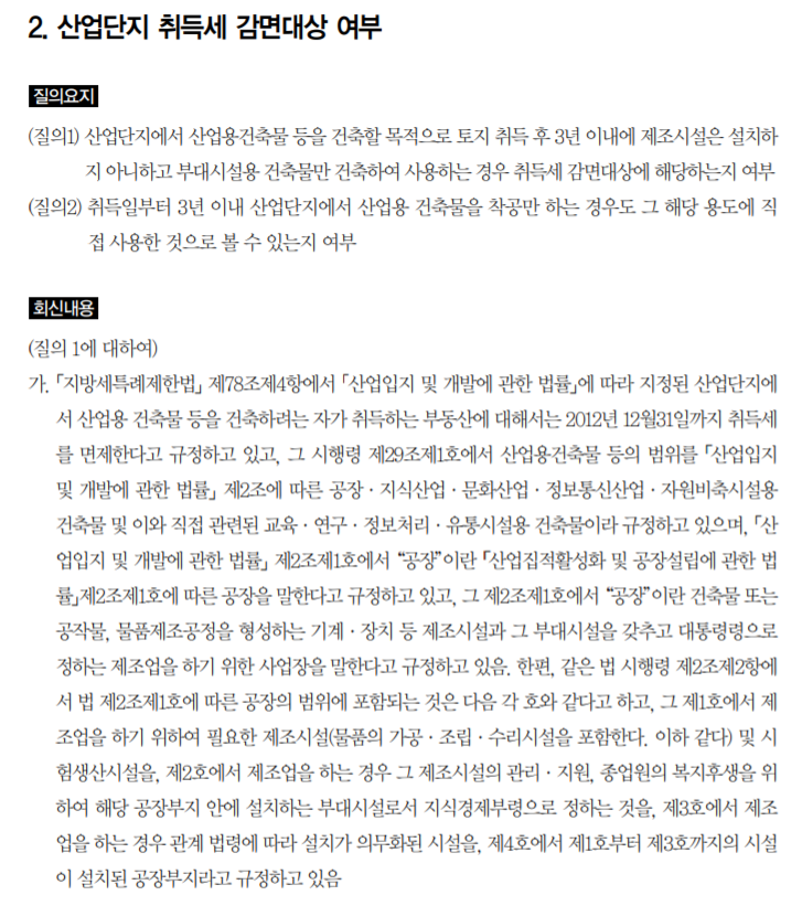 4. 지방세특례제한법 제78조 산업단지 등에 대한 감면에서 「산업입지 및 개발에 관한 법률」제16조에 따른 산업단지개발사업의 시행자 등이 취득하는 부동산에 대하여는 2012년 12월 31일까지 취득세를 면제하도록 규정하고 있으며, 농어촌특별세법 제5조에 따라 취득세 감면세액의 100분의 20을 농어촌특별세로 납부하여야 하오니 참고하시기 바랍니다.